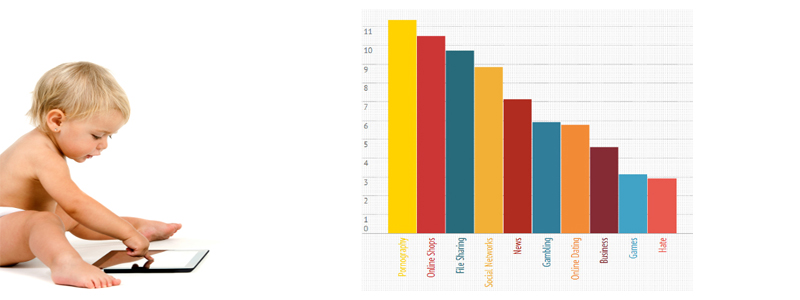 Interesele copiilor pe internet sunt : pornografie – 11.35%, magazine online- 10.49%, transfer fisiere – 9.71% , retele sociale – 8.84%, stiri – 7.13, jocuri de noroc – 5.91%, online dating – 5.77%, afaceri – 4.58%, jocuri- 3.14%, site-uri instigatoare la ura – 2.91%, altele – 30.17%.